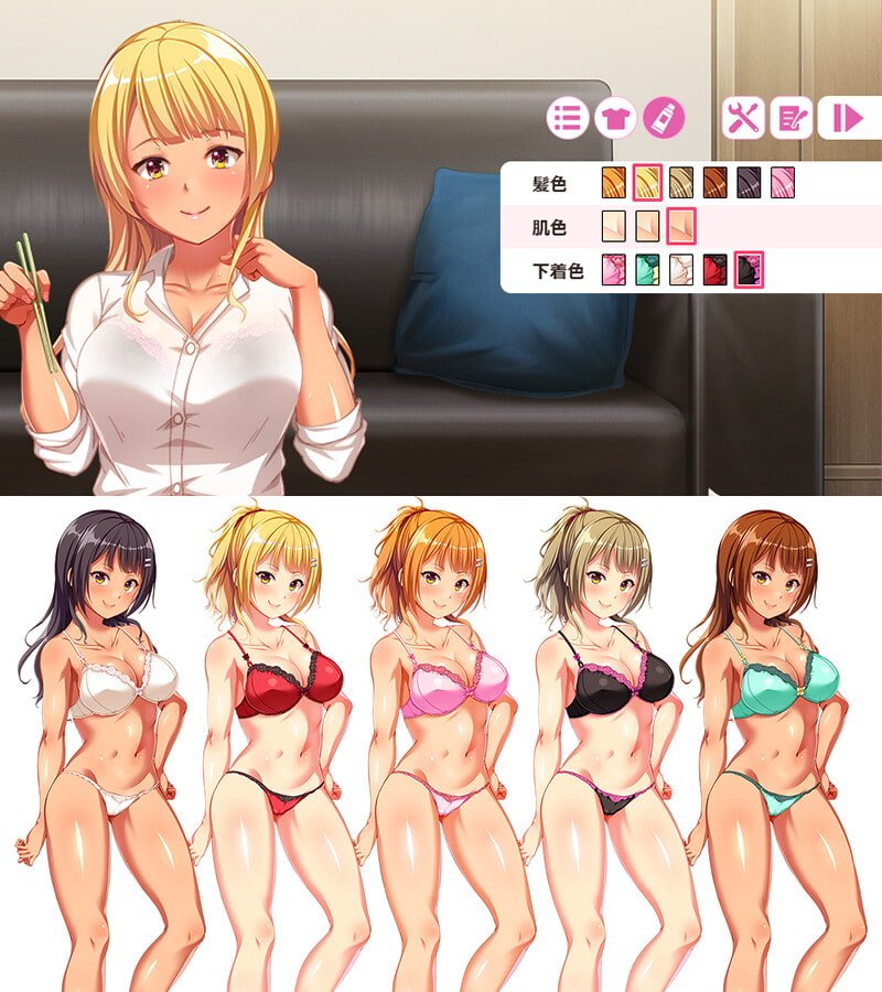 此外,除了部分内容外,几乎所有的CG都支持服装穿脱,以及继承了前作广受好评的发色/肤色/内衣颜色变更的自定义颜色功能。