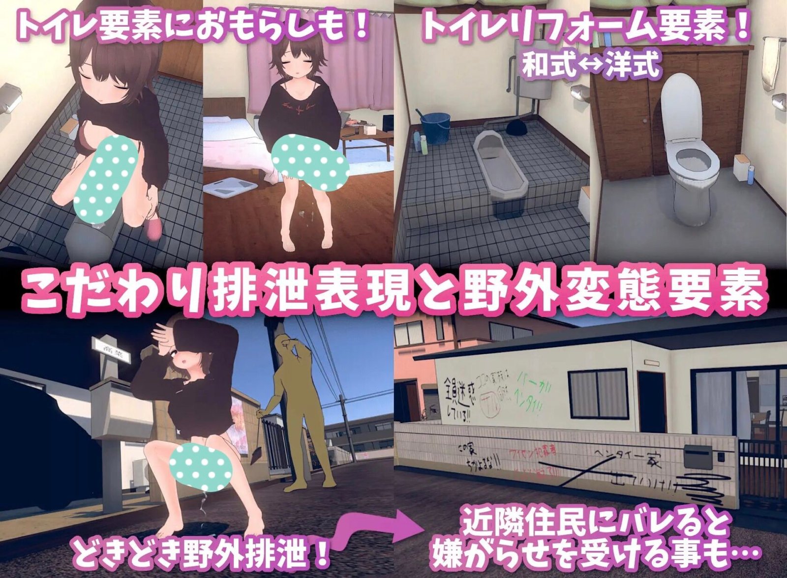 根据时间推移和饮食状况,女主角会进行排泄行为。如果来不及上厕所,还可能尿裤子…。此外,在浴室内也可以直接排尿…。