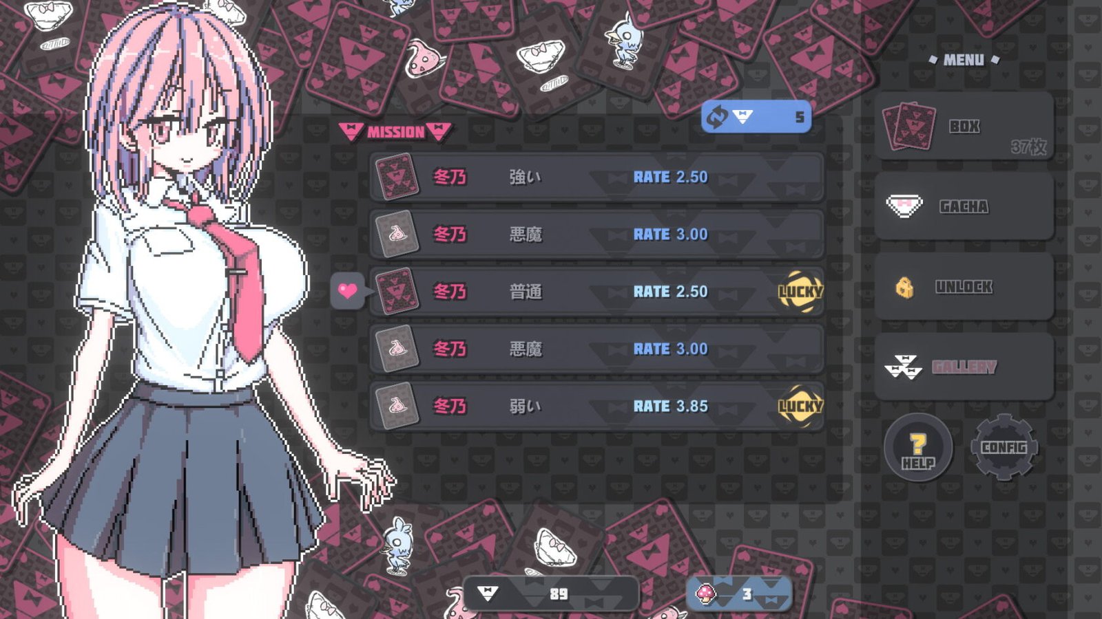 在卡牌对战中获胜取得胖次点数,一边使用胖次点数抽卡及解锁各种要素,一边努力脱光女孩们的衣服吧。